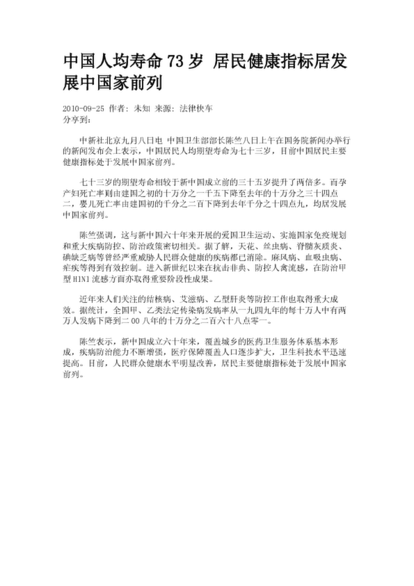 中國(guó)人均壽命73歲 居民健康指標(biāo)居發(fā)展中國(guó)家前列