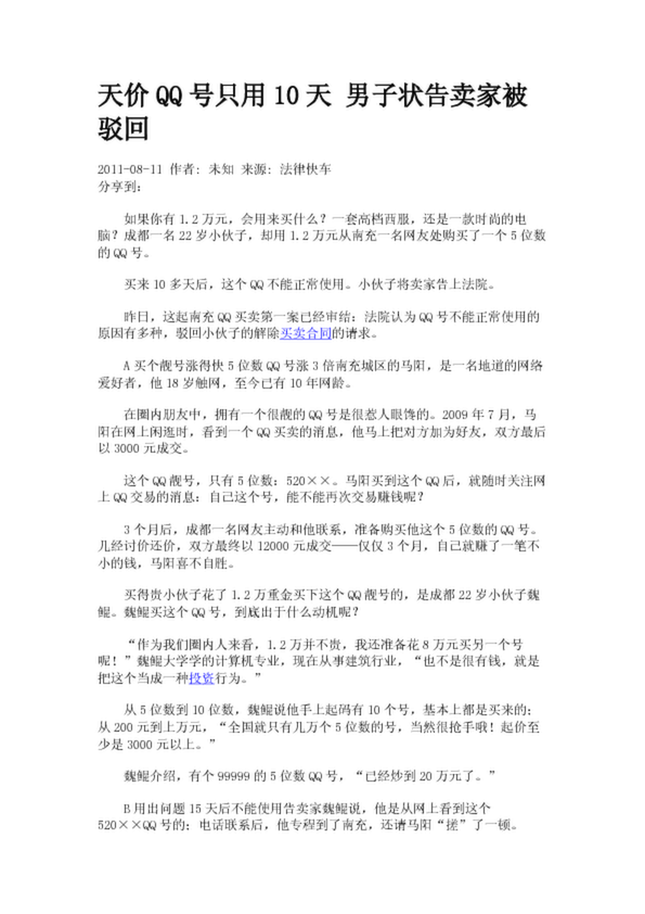 天價QQ號只用10天 男子狀告賣家被駁回(6.38KB)