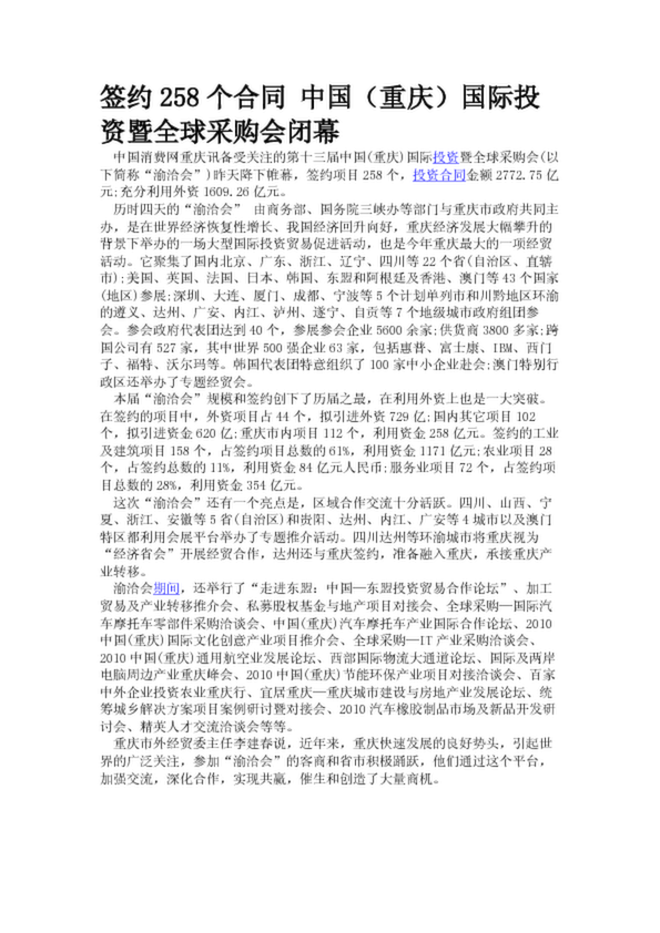 簽約258個合同 中國(重慶)國際投資暨全球采購會閉幕(19.52KB)