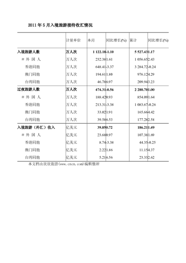 2011年5月入境旅游接待收匯情況