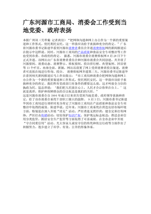 廣東河源市工商局、消委會工作受到當地黨委、政府表揚